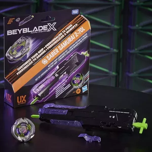 Beyblade X Victory Grip Deluxe launcher en Saber Samurai tol.
